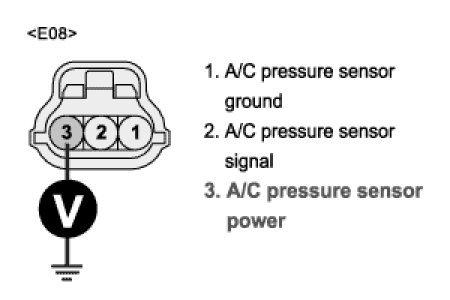 4. Measure the voltage between terminal 3 of A/C pressure sensor harness connector and chassis ground.