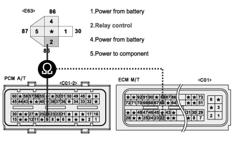 2. Disconnect main relay and ECM connector