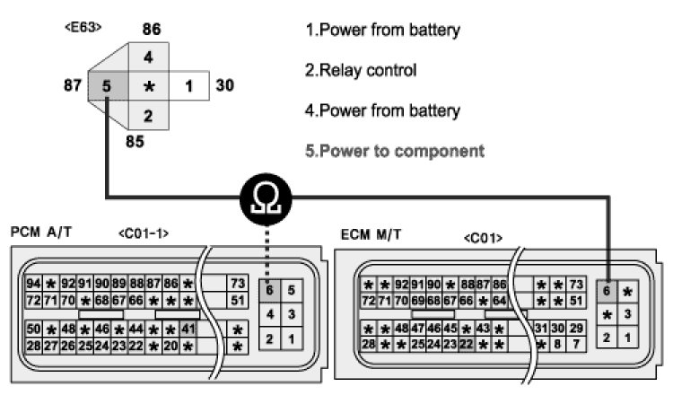 3. Measure the resistance between terminal 5 (87) of main relay harness connector and terminal 6/C01-1 of PCM harness connector. (AT)