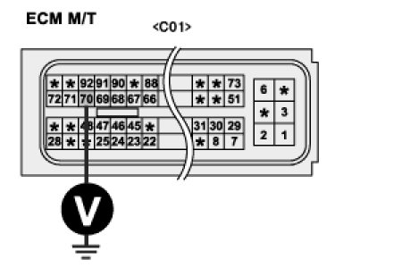 Measure the voltage between terminal 70/C01 of ECM harness connector and chassis ground. [M/T]