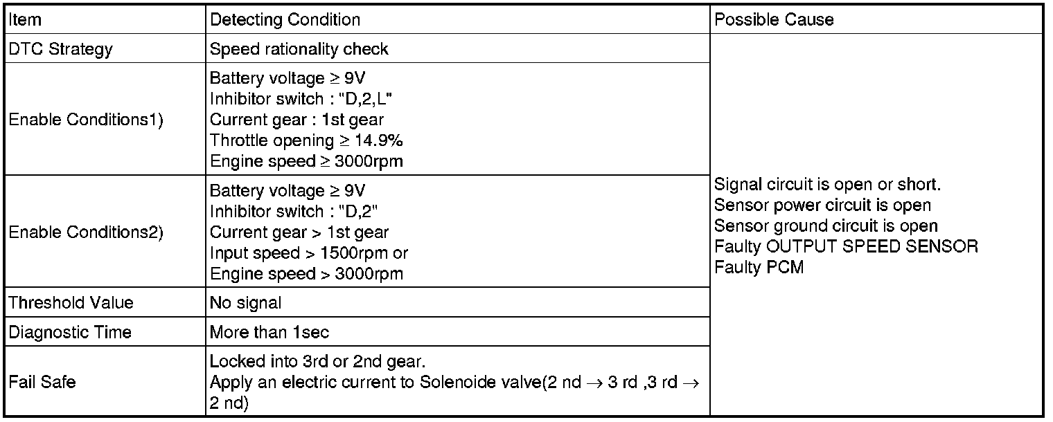 The PCM/TCM sets this code if the calculated value of the signals is noticeably different from the value calculated, using the Vehicle Speed Sensor output, when the vehicle is running faster than 30 km/h. The PCM/TCM will initiate the fail safe function if this code is detected.