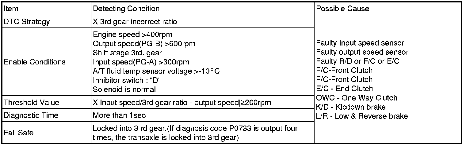 This code is set if the value of input shaft speed is not equal to the value of the output shaft, when multiplied by the 3rd gear ratio, while the transaxle is engaged in 3rd gear. This malfunction is mainly caused by mechanical troubles such as control valve sticking or solenoid valve malfunctioning rather than an electrical issue.