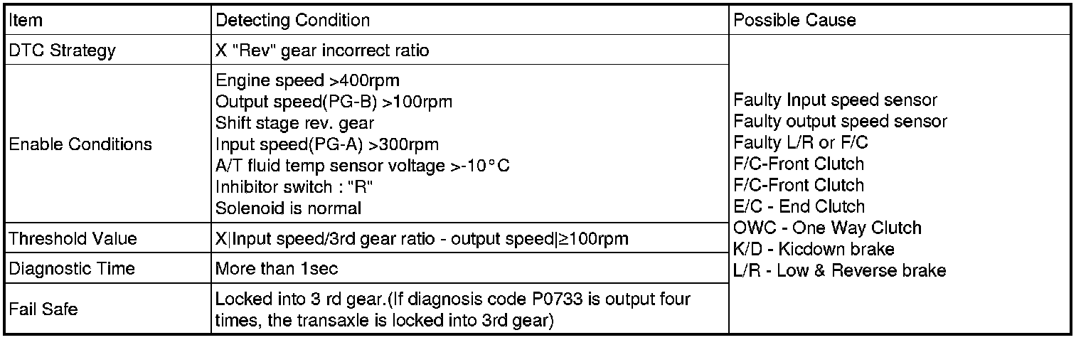 This code is set if the value of input shaft speed is not equal to the value of the output shaft, when multiplied by the reverse gear ratio, while the transaxle is engaged in reverse gear. This malfunction is mainly caused by mechanical troubles such as control valve sticking or solenoid valve malfunctioning rather than an electrical issue.