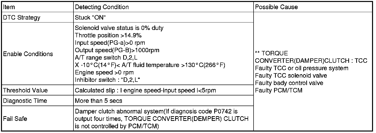 The PCM/TCM increases duty ratio, to engage the Damper Clutch, by monitoring slip RPMs. (difference in value between engine speed and turbine speed). However, If a very small amount of slip RPM is maintained, the TCM applies 0% duty ratio value, then the TCM judges that the Torque Converter Clutch is stuck ON and sets this code.