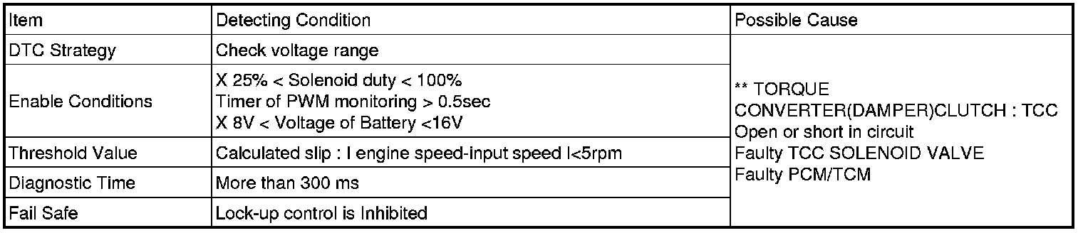 The PCM/TCM checks the Damper Clutch Control Signal by monitoring the feedback signal from the solenoid valve drive circuit. If an unexpected signal is monitored, (For example, high voltage is detected when low voltage is expected, or low voltage is detected when high voltage is expected) the TCM judges that the DCCSV circuit is malfunctioning and sets this code.