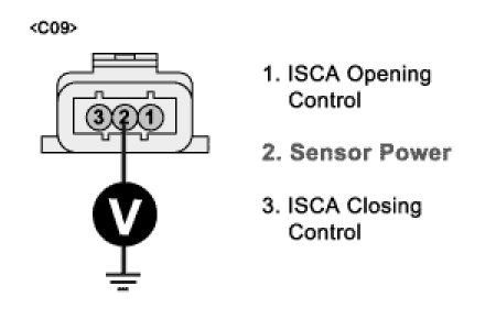 4. Measure the voltage between terminal 2 of ISCA harness connector and chassis ground.
