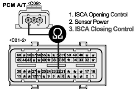(3) Measure the resistance between terminal 3 of ISCA harness connector and terminal 22/C01-2 of PCM harness connector. [A/T]