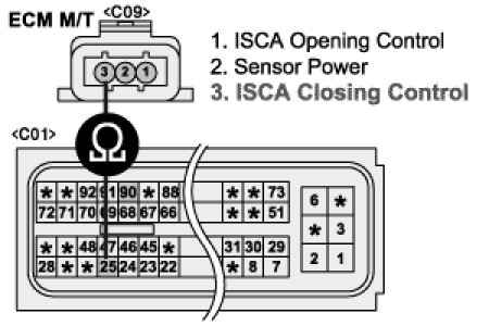 Measure the resistance between terminal 3 of ISCA harness connector and terminal 25/C01 of ECM harness connector. [M/T]