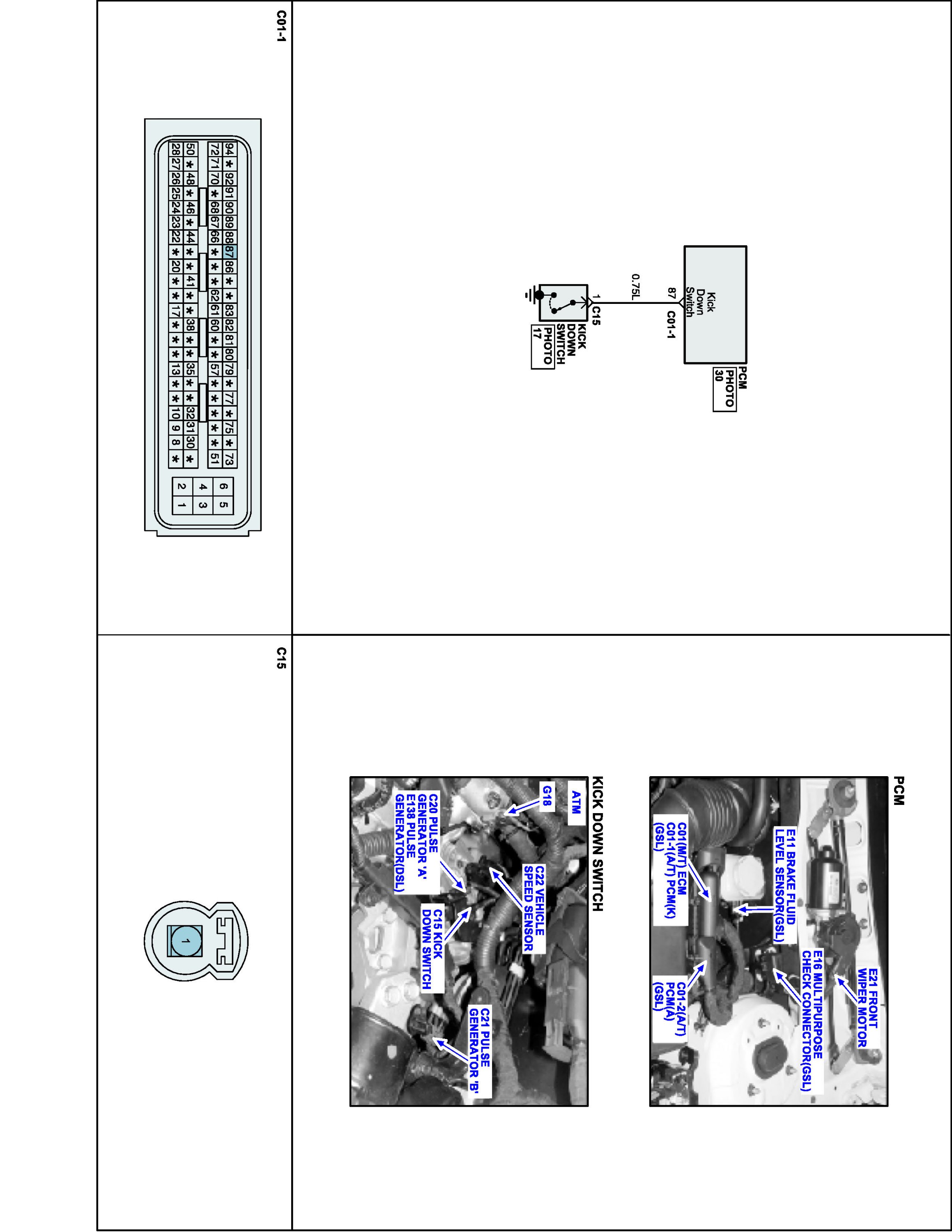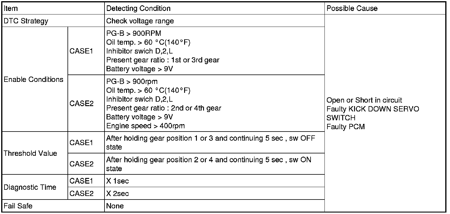 The TCM sets this code if the Kick Down Servo switch is ON when the gear is in the 2nd or 4th position, or the switch is OFF when the gear is in the 1st or 3rd position.