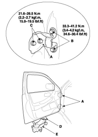 - After installing the door, check for a flush fit with the Body, then check for equal gaps between the front, Rear, and bottom, door edges and the body. Check That the door and body edges are parallel. Before Adjusting, replace the mounting bolts.
