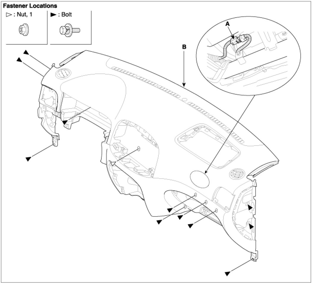 3. Loosen the bolt`s and nuts then remove the main crash pad assembly(B).
