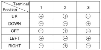 4. Apply battery voltage to each terminal as shown in the table and verify that the mirror operates properly.