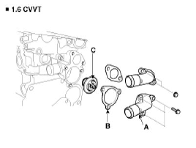 2. Remove the water inlet fitting(A), gasket(B) and thermostat(C).