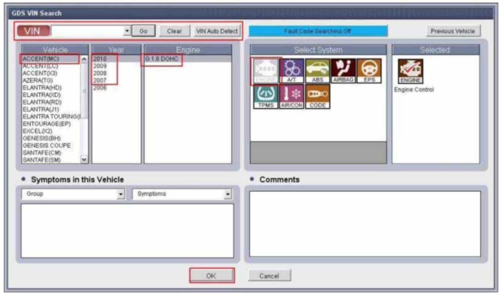 2. Enter the vehicle information by pressing the VIN Auto Detect button, entering the vehicle's VIN or selecting the vehicle model, model year, engine/fuel type and ENGINE as the system and then click OK.