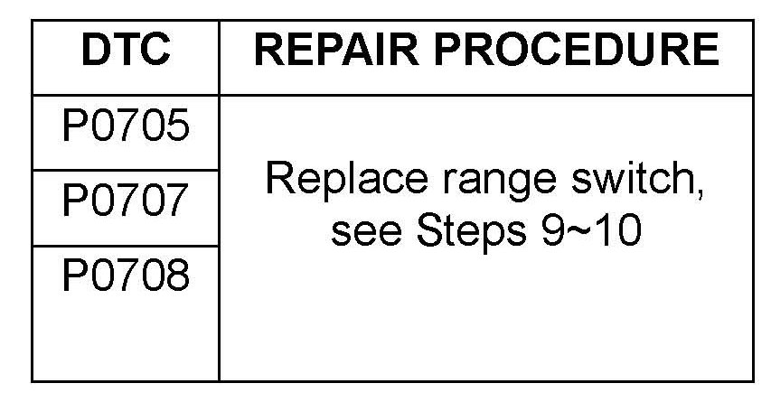8. Inspect the connector to the range switch for a bent pin or pin not fully inserted and related wiring for an open or short circuit. If OK, follow the repair procedure below: