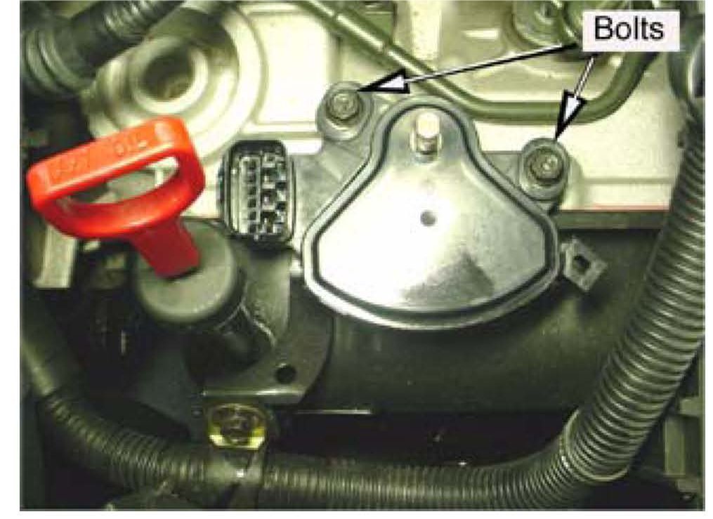 13. Insert a 5mm drill or M5 (5mm) bolt in the adjustment hole of the range switch. Tighten the two 10 mm mounting bolts to specification. Remove the 5mm drill or M5 bolt.