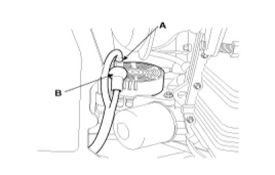 8. Disconnect the alternator connector (A), and remove the cable (B) from alternator "B" terminal.