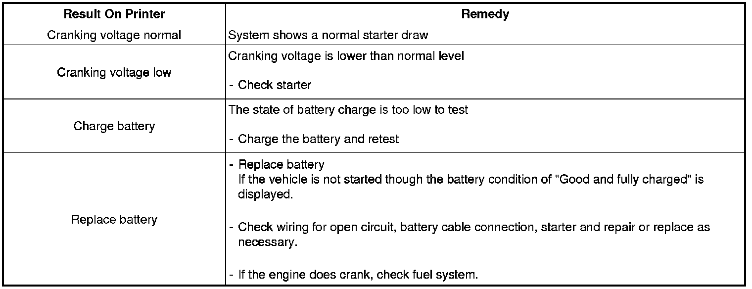 6. Take a relevant action according to the test results by referring to the table below after shutting off the engine and disconnect the tester clamps from the battery.