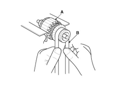 4. Check the commutator (A) surface. If the surface is dirty or burnt, resurface with emery cloth or a lathe within the following specifications, or recondition with #500 or #600 sandpaper (B).
