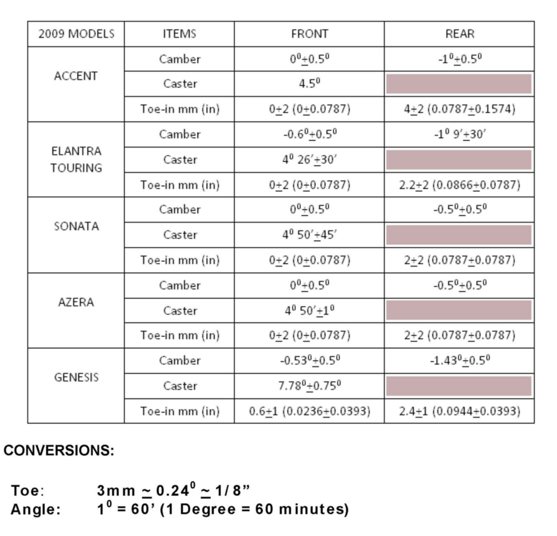 ALIGNMENT SPECIFICATIONS - 2009 MY PASSENGER VEHICLES