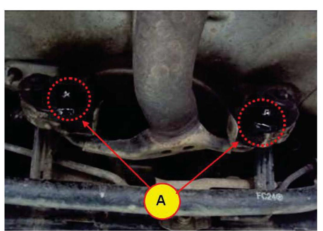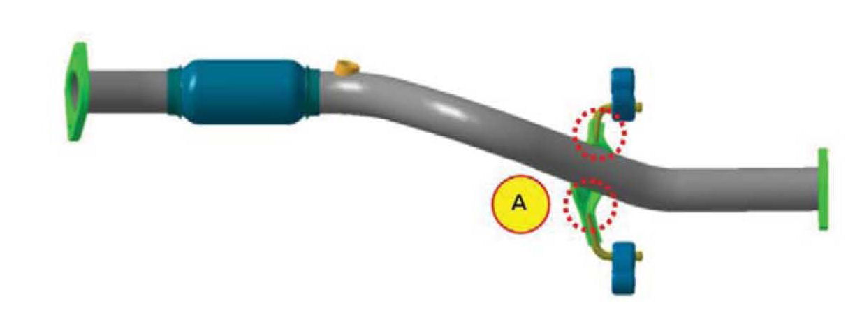 3. Inspect the front muffler pipe hanger bracket (A) for any signs of separation from the muffler pipe