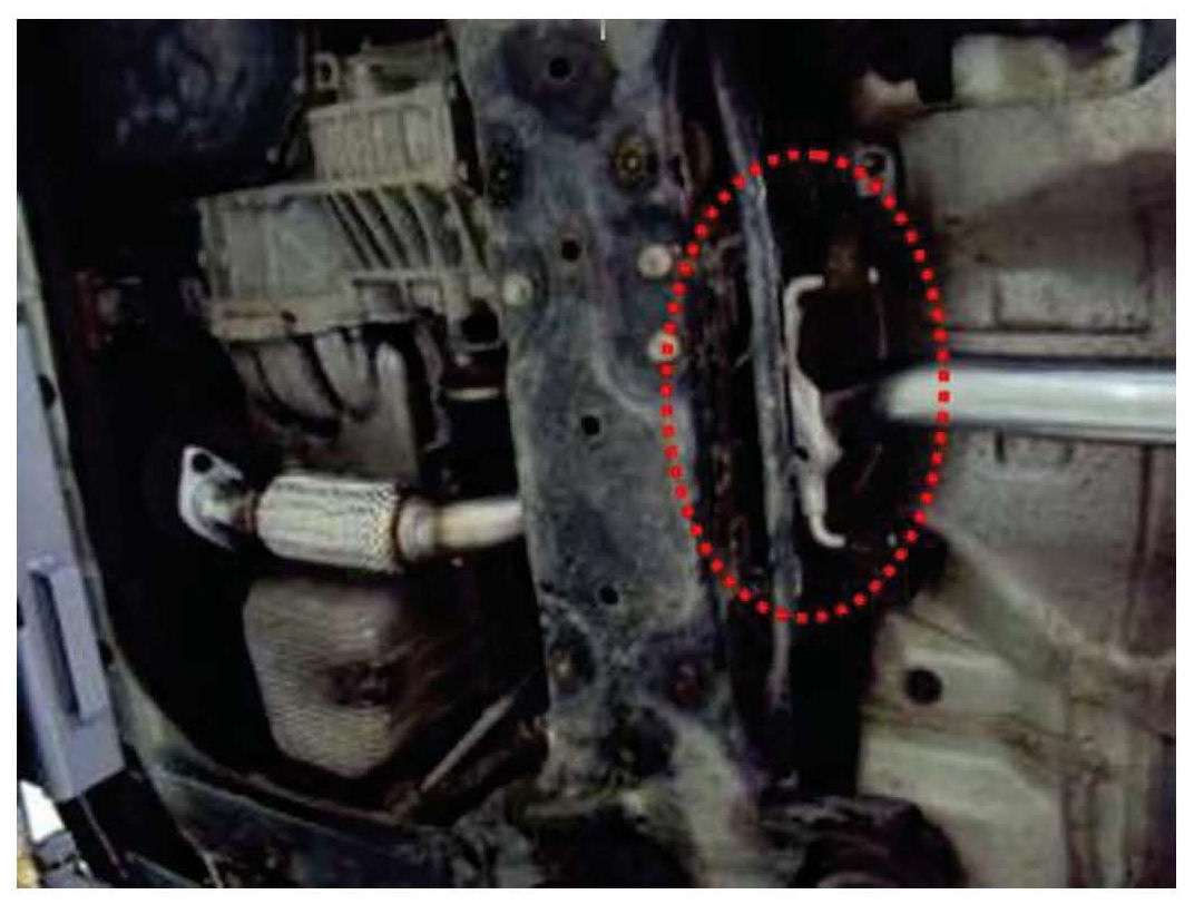 2. Locate the front muffler pipe hanger bracket as indicated in the photo on the right.