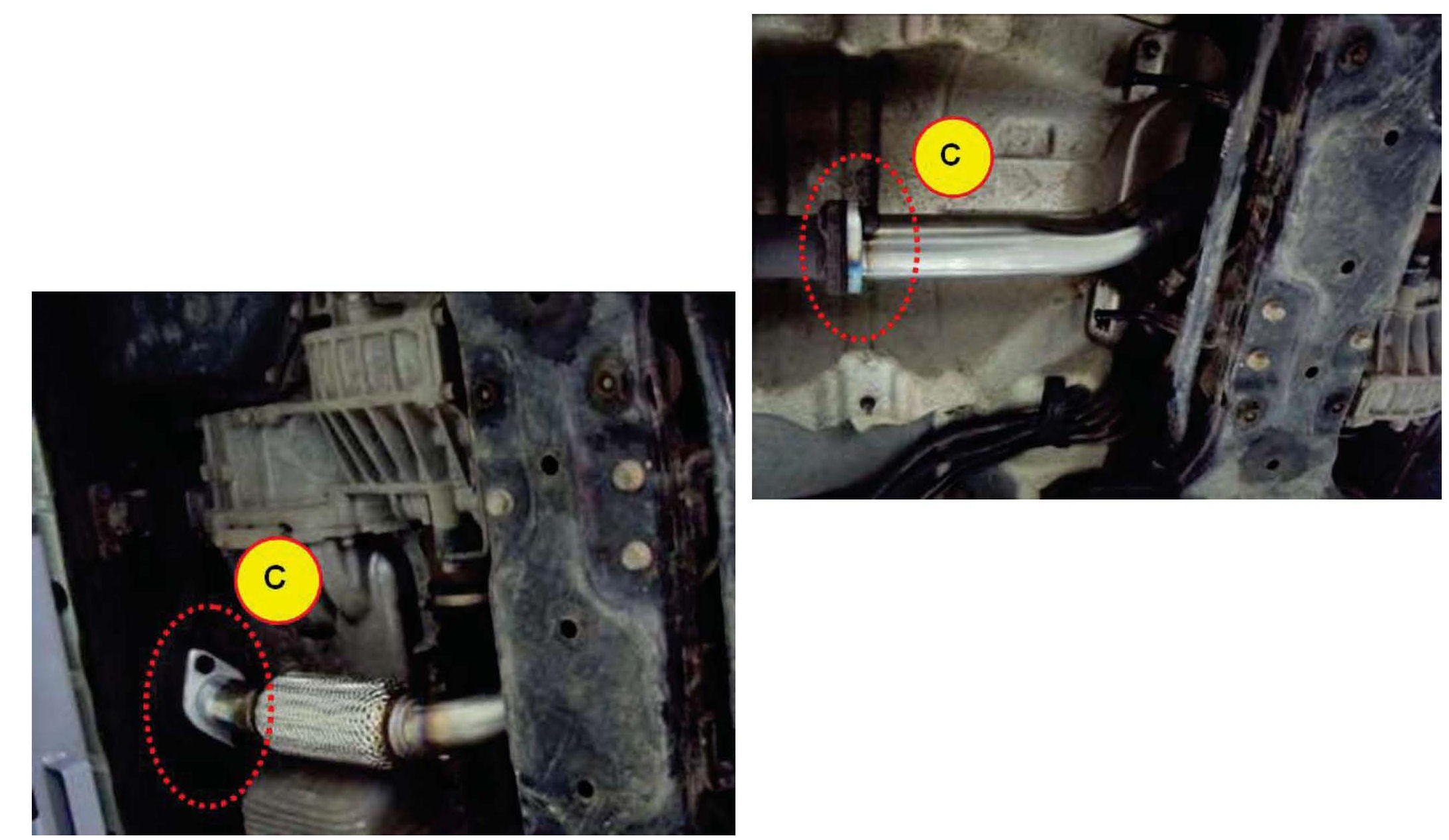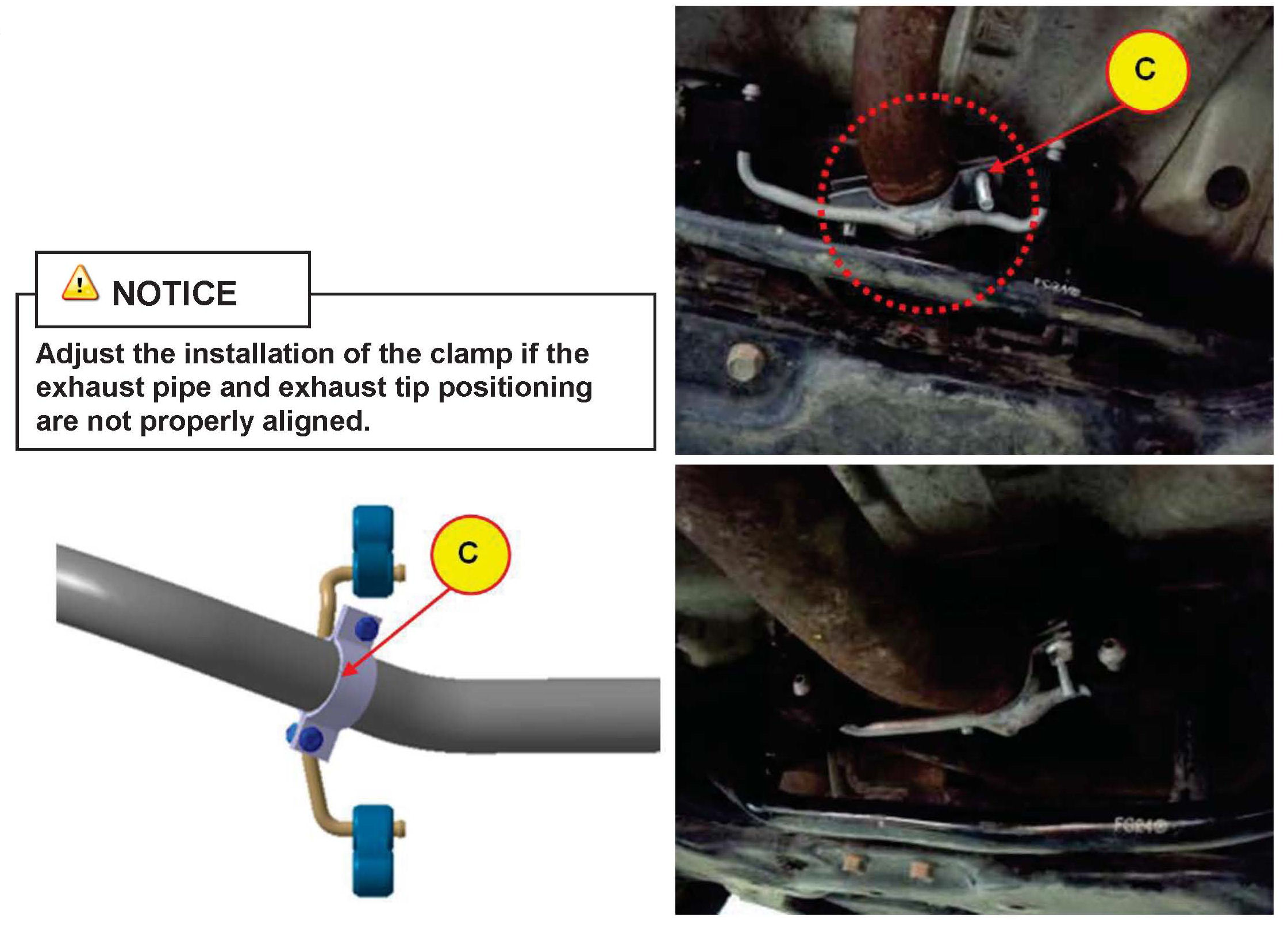 3. Install the new front muffler pipe hanger bracket (C) to the original position by tightening the mounting nuts with specified tightening torque.