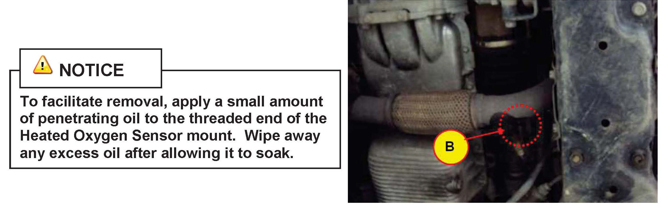 2. Disconnect and remove the Heated Oxygen Sensor (B) from the front muffler.
