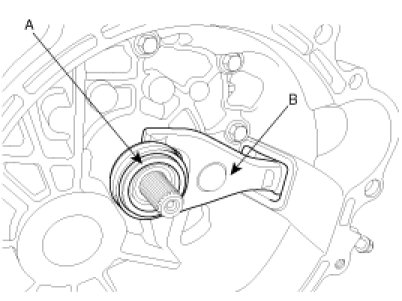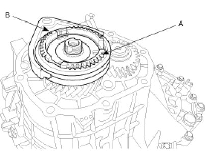11. Remove the 5th synchronizer hub&sleeve assembly (A) and the shift fork (B).