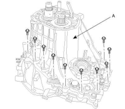 17. Remove the transaxle case (A) by removing the mounting bolts (14ea).