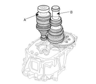 25. Remove the input shaft (A) and output shaft (B) assembly together from the clutch housing.