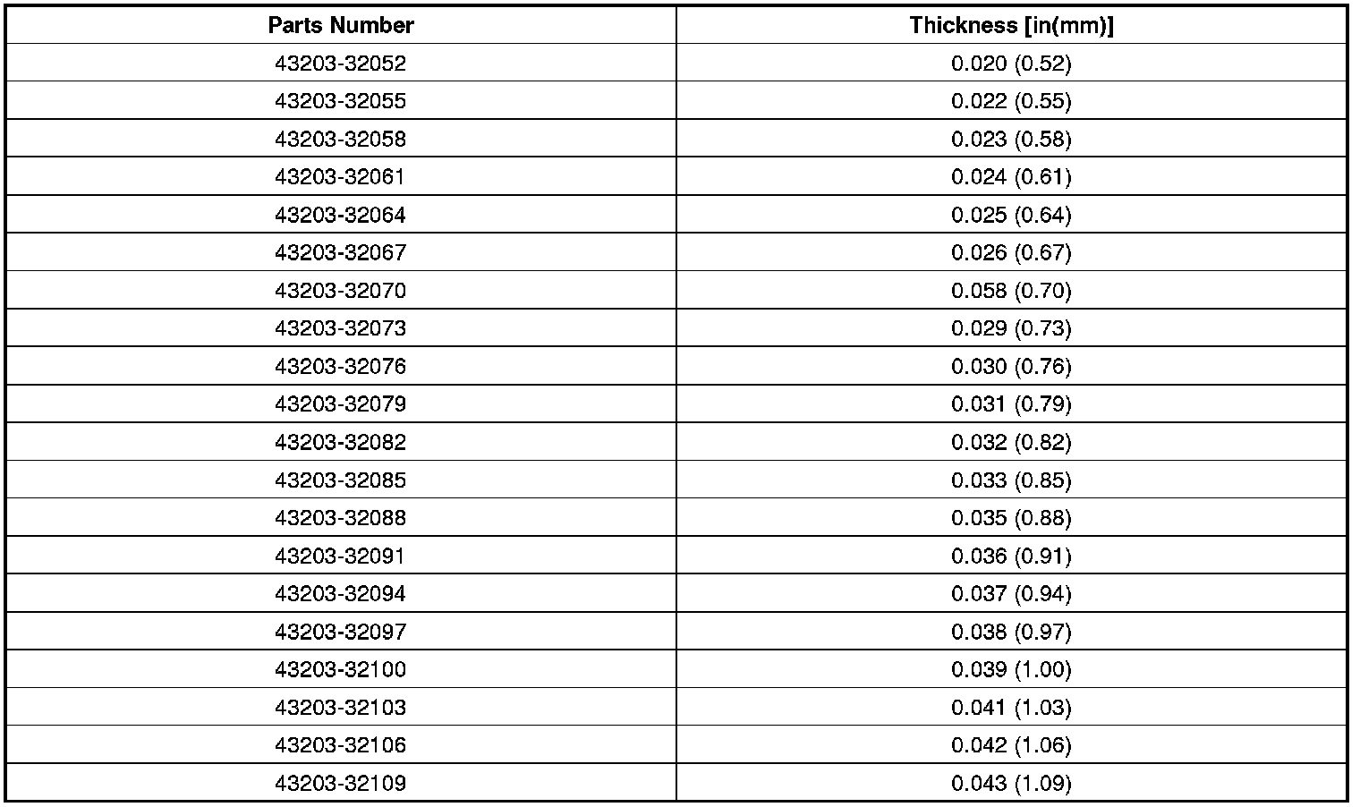 Thickness of space [in(mm)] = (height of housing [in(mm)] + transaxle case [in(mm)]) - the length ofdifferential [in(mm)] + end play [0.0007in (0.175mm)] + tolerance [0.0019in (0.05mm)]