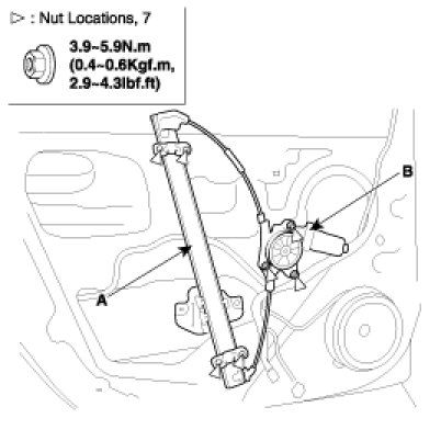4. After disconnecting window motor connector(B), loosen the door regulator mounting nuts and window motor mounting nuts, remove the door regulator(A).