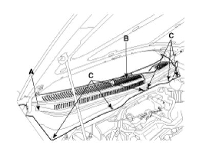 2. Remove the weather strip (A) then remove the cowl top cover (B) after removing 6 clips (C).