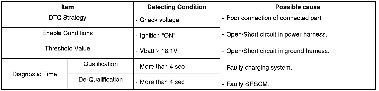 The SRSCM sets DTC B1101 and turns warning light on if voltage above threshold value is detected for more than 4 sec.