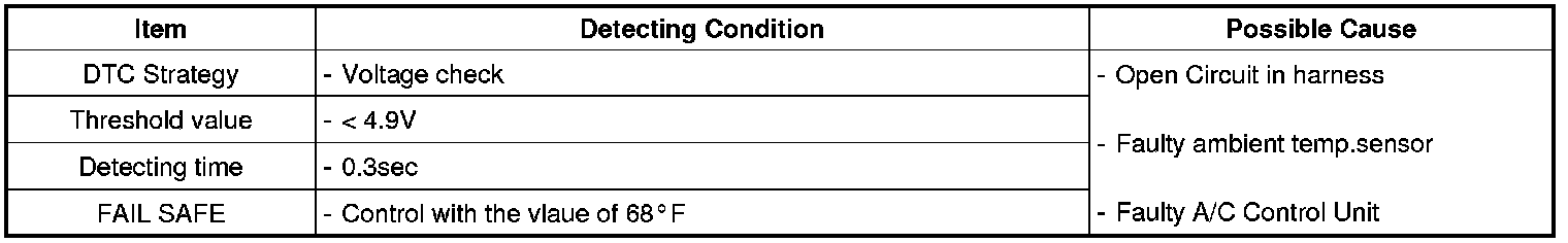 The ECM sets DTC B1238 if there is an open circuit in ambient temp sensor signal harness or the measured voltage value of the sensor is more than the threshold value (4.9V)