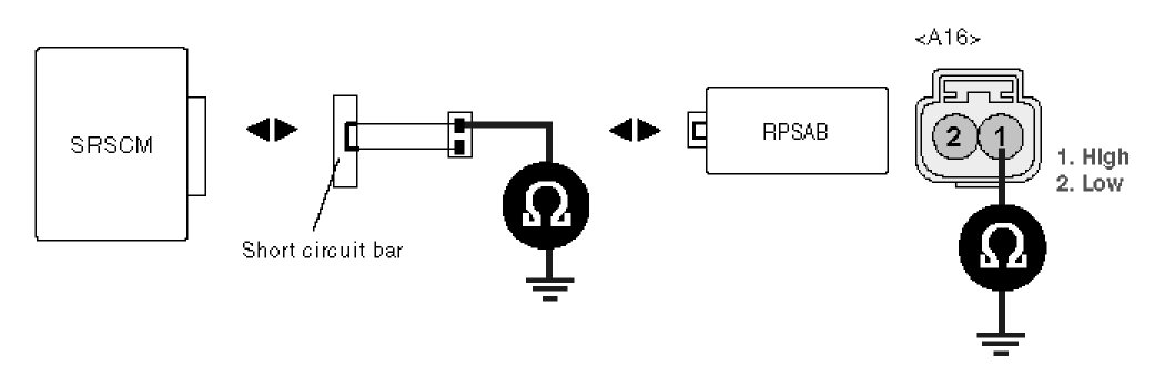 4. Measure resistance between terminal "1" or "2" of the RPSAB harness connector and chassis ground.