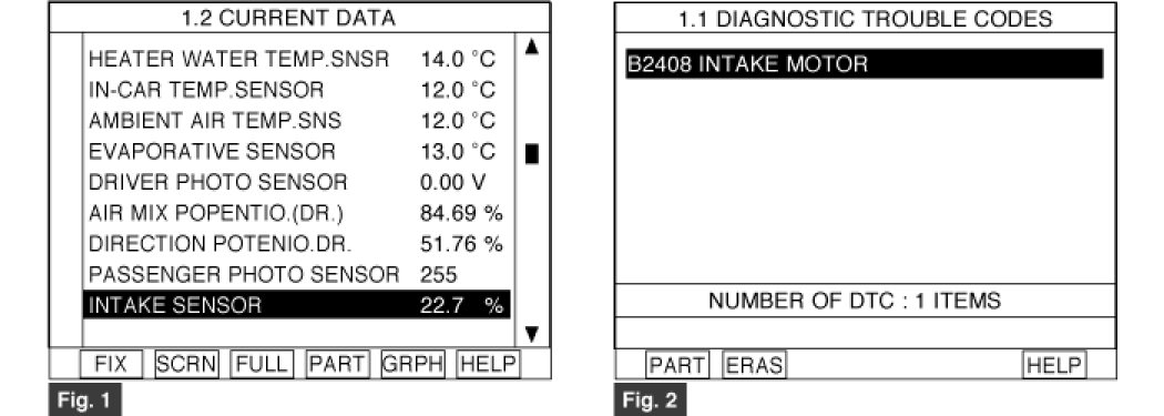 ** There is any fault in Intake actuator. If the parameter of "Intake potentiometer" is 30% or less when the actuator operates to the FRE position, or If the parameter is 60% and more when the actuator operates to the REC position