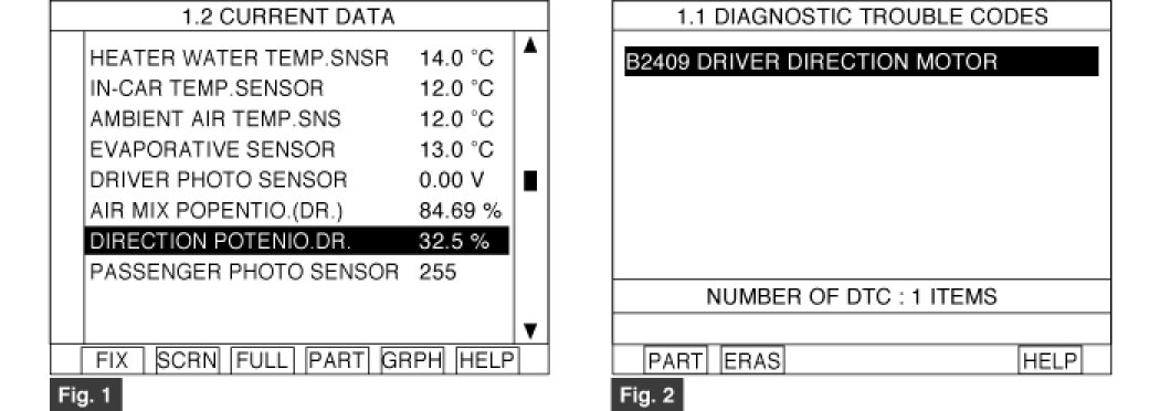 ** There is any fault in DR Direction Motor. If the parameter of "DR DIRECTION POTENTIO" is 10% or less on "VENT" mode, or If the parameter is 90% or more on "DEF" mode.