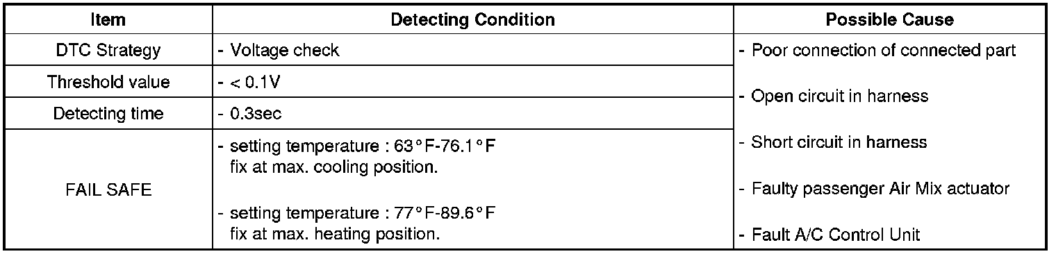 The ECM sets DTC B2415 if the passenger air mix actuator doesn't move to intended position within 40 sec (The ECM attempts to move the temp door for a 2 second duration at a frequency of 3 times every 20 seconds before storing a DTC.)
