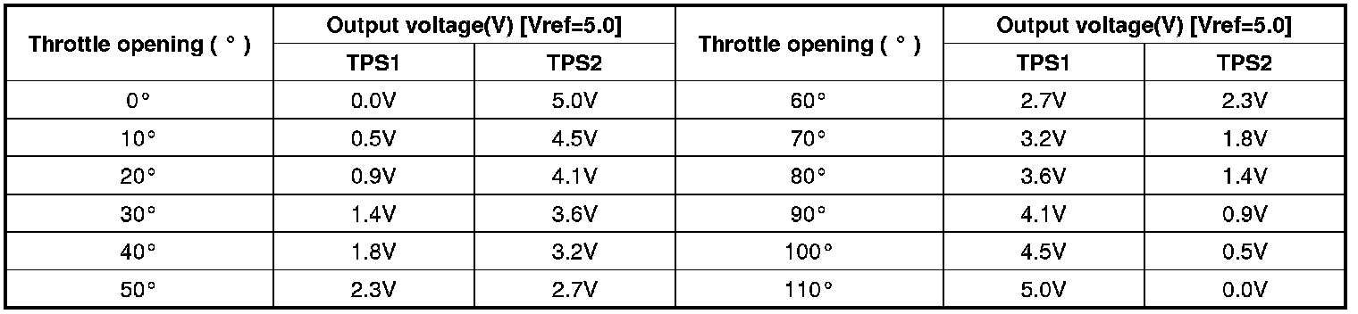 Checking output signals from TPS2 every 8.5 sec. under detecting condition, if an output signal is above 4.75V for more than 0.1 sec., PCM sets P0223. MIL (Malfunction Indication Lamp) turns on when the malfunction lasts till con secutive 2 driving cycle.