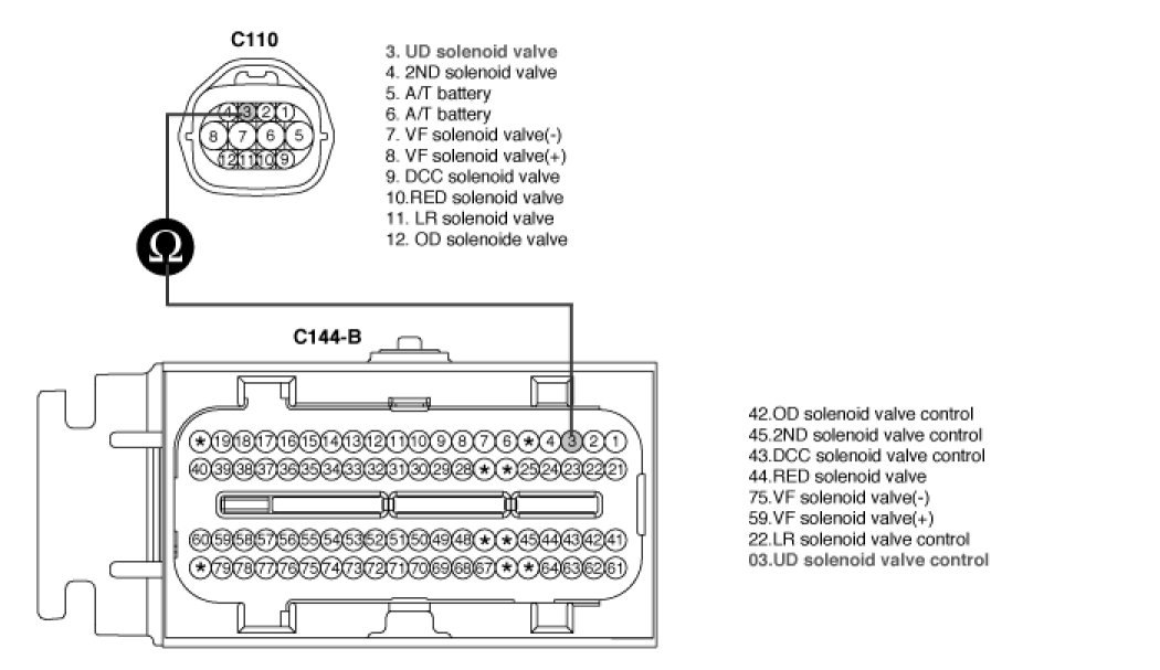 2. Disconnect "A/T SOLENOID VALVE" connector and "PCM/TCM" connector