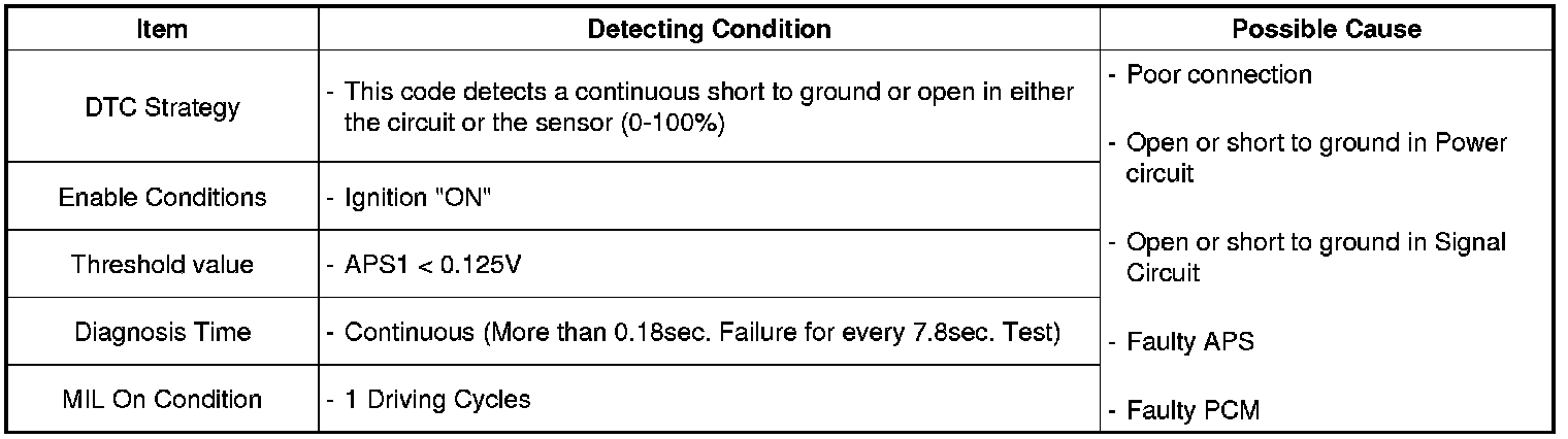 Checking output signals from APS 1 under detecting condition, if output signals are below the threshold, PCM sets P2122. MIL (Malfunction Indication Lamp) turns on when the malfunction lasts till 1 driving cycle.