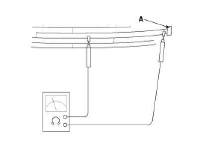 2. Touch one tester probe to the glass antenna terminal (A) hear, and move the other tester probe along the antenna wires to check that continuity exists.