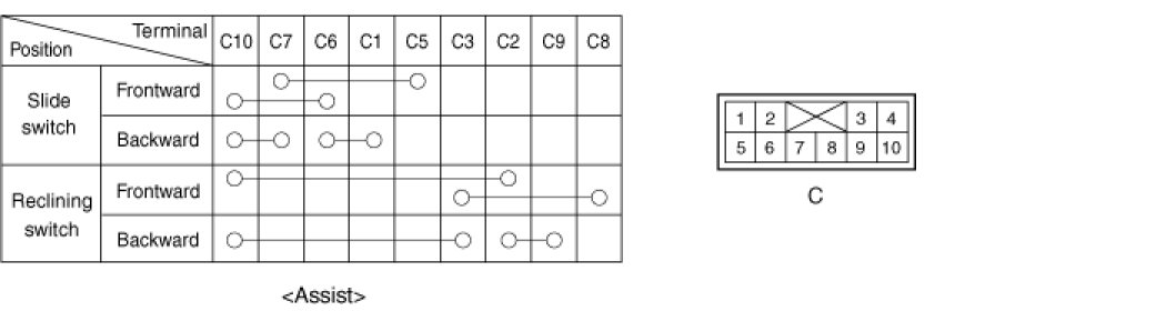 in each position, make sure that continuity exists between the terminals below. If continuity is not as specified, replace the power seat switch.