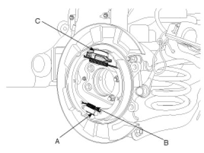 13. Remove the parking brake wire connecting hook(C) from the brake shoe.