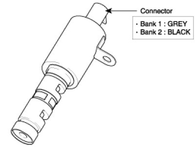 Continuously Variable Valve Timing (CVVT) system controls valve overlap with forcibly activating the camshaft and adjusts EGR (Exhaust Gas Recirculation) amount. It decreases exhaust gas (NOx, HC) and improves fuel economy, idle state, torque in low speed and power in high speed. This system uses engine oil pressure and consists of the two CVVT Oil Control Valves (OCV) in each bank which supplies oil to cam phaser according to PWM (Pulse Width Modulator) signal of the PCM, a CVVT Oil Temperature Sensor (OTS) which detects the oil temperature and a cam phaser which is installed on the end of the camshaft and converts camshaft phase. The oil getting out of the CVVT oil control valve flows into the cam phaser and rotates the rotor inside cam phaser. At this time, the camshaft rotates with the rotor and the cam phase is changed.