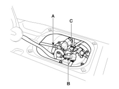 2. Disconnect the Fuel Feed Quick-Connector (A), Fuel Tank Pressure Sensor Connector (B) and Fuel Pump & Sub Fuel Sender Connector (C).