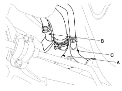 6. Disconnect the Fuel Feed Hose (A), Leveling Hose (B) and Canister Ventilation Hose (C).