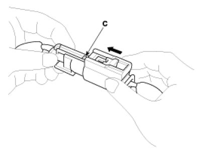 1. To reconnect, hold the pawl-side connector half, and press on the back of the sleeve-side connector half in the direction shown. As the two connector halves are pressed together, the sleeve (A) is pushed back by the pawl (C). Do not touch the sleeve.